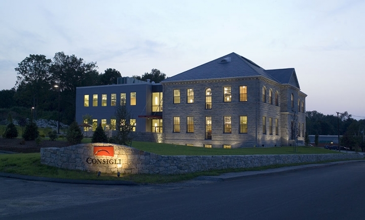 Consigli Construction Headquarters, Milford MA Renovation and expansion of an historic 1896 granite school building listed on the National Register of Historic Places re-purposed for the offices of an expanding Boston-based construction company. The granite building was moved stone-by-stone from its original location to the new site. The new entrance to the facility placed between the stone building and a contemporary addition to the rear, distinguishing new from old.